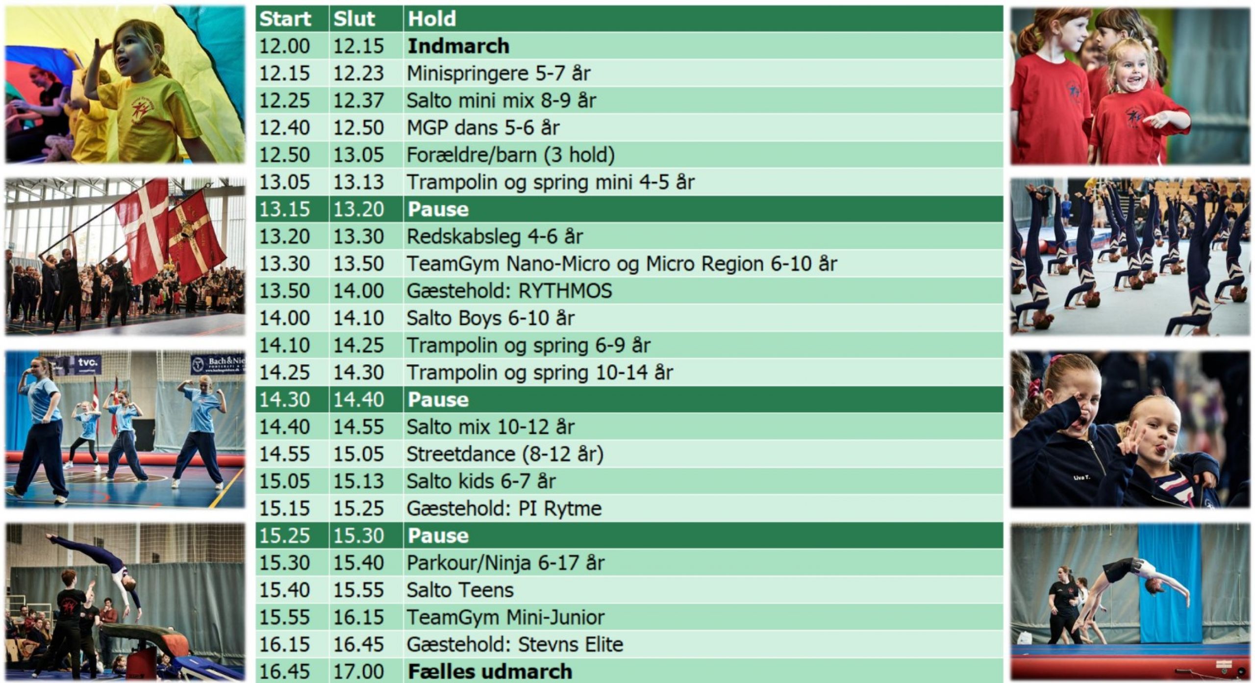 I år får vi besøg af hele tre gæstehold. Fra Gladsaxe får vi besøg af Rythmos - et rytme-/dansehold for voksne, fra København kommer PI Rytme og Stevns Gymnastikefterskole sender deres elitehold. Dagen vil være fyldt med skøn gymnastik fra blandt andet vores børnehold, parkour, springhold og konkurrencehold – I kan godt begynde at glæde jer!